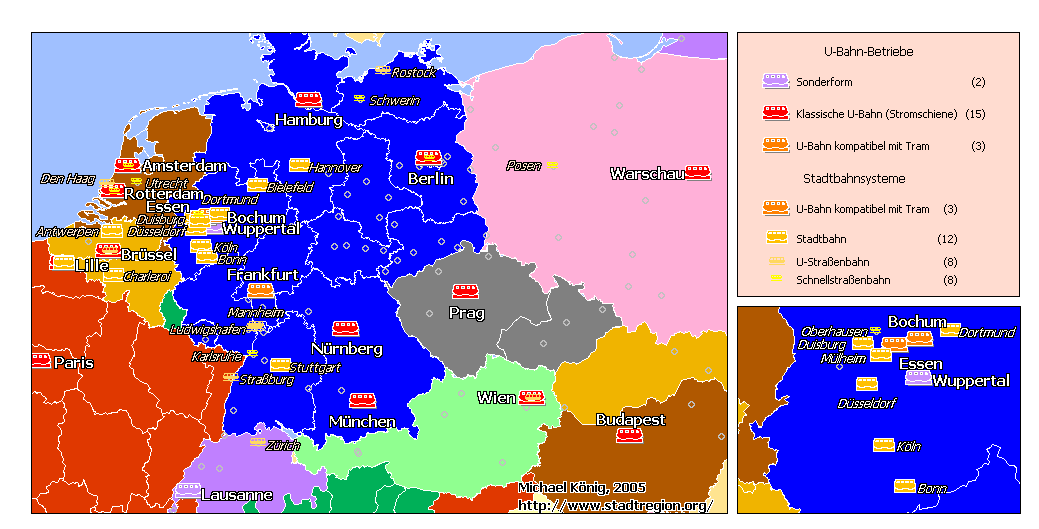 | Frankfurt | Aus der Straßenbahn entwickeltes, aber mittlerweile getrennt betriebenes System. Drei Strecken unterschiedlicher Ausbauqualität und insgesamt zehn Endpunkte. Außerdem Straßenbahn und S-Bahn. |
